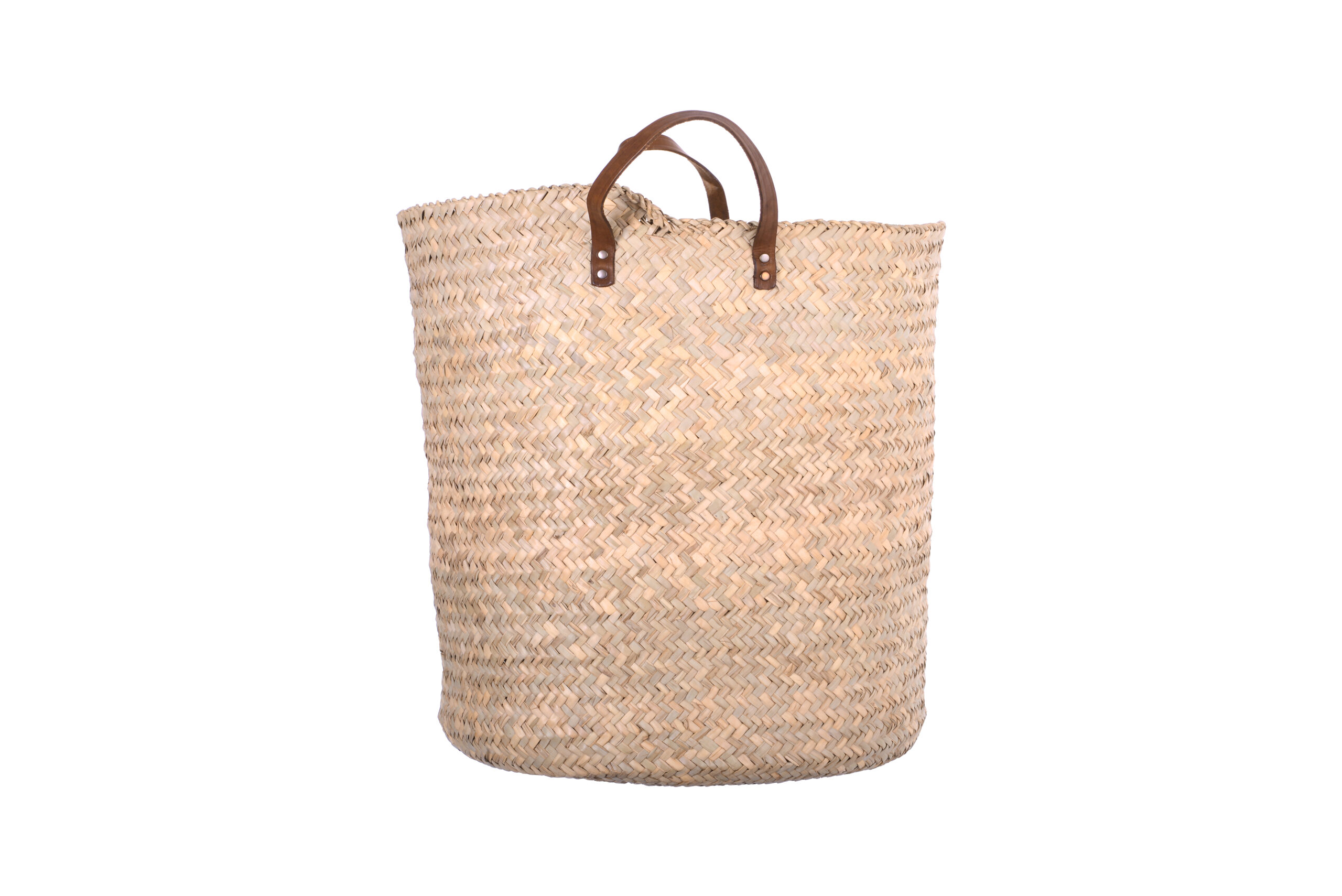CESTO DE PALMA RÚSTICO MEDIANO, CON ASAS DE CUERO. (40CM X 42CM) HECHA A MANO.